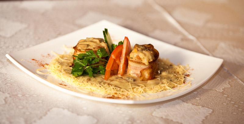 Мясо «Атаман», мясо, фаршированное языком и сыром, судак в кунжутной корочке с помидорами под бальзамическим соусом. Ну просто пальчики оближешь.