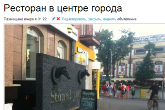 В ночь с четверга на пятницу на сайте интернет-сервиса avito.ru появилось объявление о продаже «действующего ресторана в центре города» с фотоиллюстрациями бара «Stoned Pony», расположенного в Калининграде по адресу улица Черняховского, 2 А. «Заведение работает в формате ресторана, а в ночное время в выходные дни трансформируется в танцевальный бар и имеет стабильную аудиторию, среди которой часто бывают медийные личности», написано в объявлении. Цена «лота» в заметке не указана.