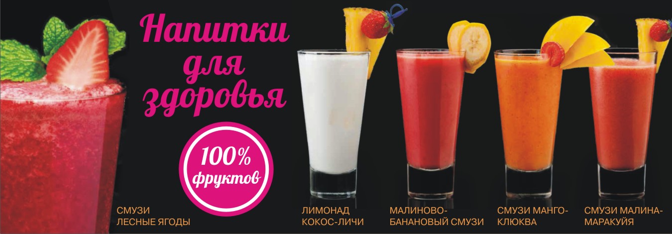 Многие напитки из нашего нового меню (смузи, коктейли) выполнены на основе натуральных фруктовых пюре и имеют невероятно запоминающиеся вкусы. Натуральное пюре получают из спелых фруктов и ягод, тщательно отобранных по всему миру. Оно богато витаминами и микроэлементами, имеет истинно натуральный вкус и естественную природную сладость спелых фруктов. Один бокал фруктового смузи зарядит вас энергией и хорошим настроение на целый день!