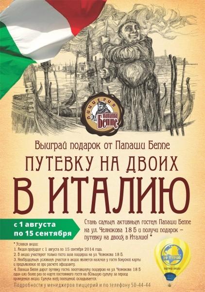 Самый активный гость моей пиццерии на ул. Челнокова, 18Б отправится на родину пиццы — в солнечную Италию — и сможет прихватить с собой друга!