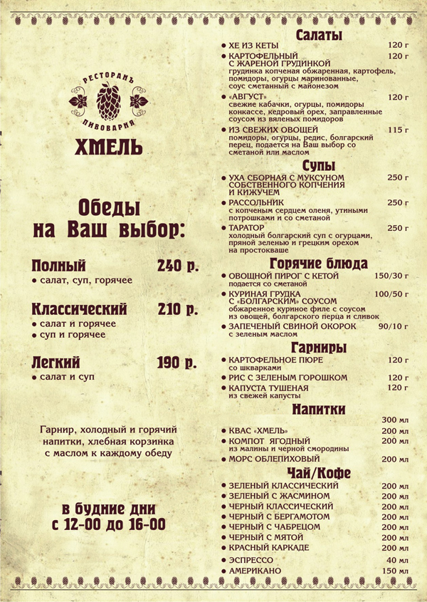 «Полный» — 240 руб., «Классический» — 210 руб., «Легкий» — 190 руб.