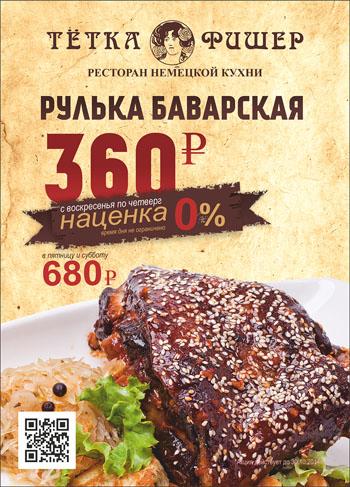 С воскресенья по четверг мы приглашаем вас отведать восхитительные блюда заведения с наценкой 0%. В этот раз мы решили предложить вам восхитительную «Баварскую рульку» по цене всего 360 руб. До встречи в ресторане!