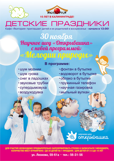 Сеть кафе «Якитория» приглашает на новую бесплатную программу от детского научного шоу «Открывашка»!