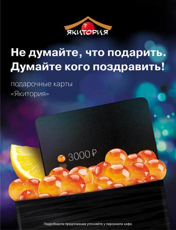 Теперь у вас есть универсальный подарок на все случаи жизни: Новый год, день рождения, профессиональный праздник, 23 февраля или 8 Марта. Подарочная карта «Якитория» будет отличным презентом по любому случаю.