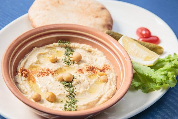 — домашний хумус-«masabacha» c лимоном, оливковым маслом, маринованным огурцом, подаём со свежей домашней питой;