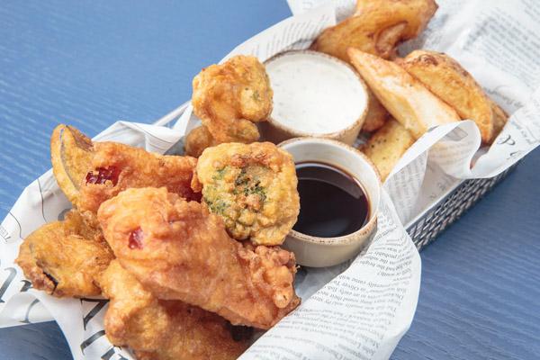 — вег’н’чипс — овощи в кляре, обжаренные во фритюре, подаём с печёным картофелем, соевым соусом и сметанным