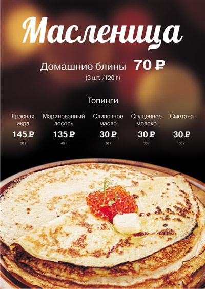 Ничего лишнего, только традиционные русские блины. А к горячим румяным блинчикам вы можете выбрать топпинги на ваш вкус: красная икра, маринованный лосось, нежная сметана, вкус детства — сгущенное молоко или просто сливочное масло.