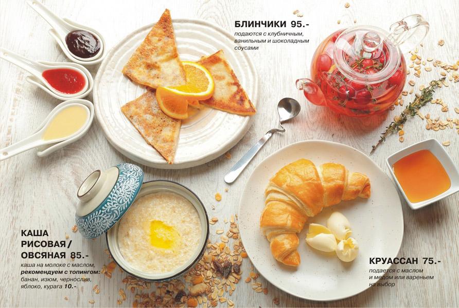 Всегда на ваш выбор: круассан с маслом и джемом, блинчики с соусами, омлеты и сандвичи, наваристые каши, тёплые роллы, а также ароматный чай, кофе по специальной цене.