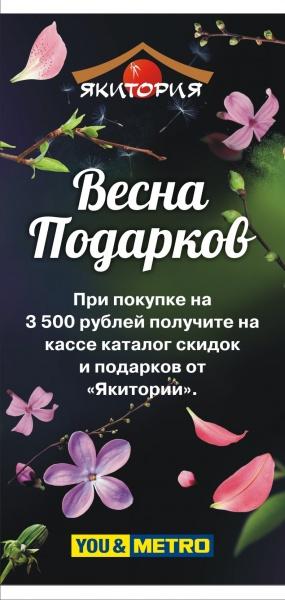 При покупке в торгом центре «Метро» на сумму 3500 руб. на кассе вы получаете каталог скидок и подарков от «Якитории».
