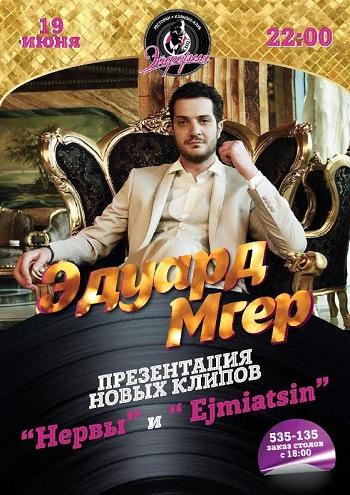 19 июня в 22:00 в ресторане, караоке-клубе «Эйфория» состоится презентация двух новых клипов звезды нашего города Эдуарда Мгера! В этот вечер вы сможете насладиться завораживающим вокалом, отведать вкусные блюда из нашего нового меню и почувствовать себя звездой. Эйфория на 7 небе ждет вас!