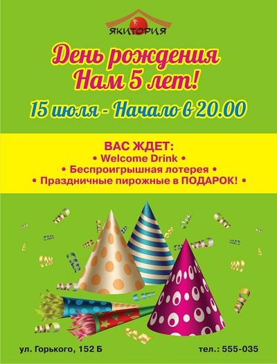 Друзья, мы будем рады видеть вас в кафе «Якитория»ул. Горького, 152 Б 15 июля в 20:00, чтобы вместе отпраздновать наш 5-летний юбилей!