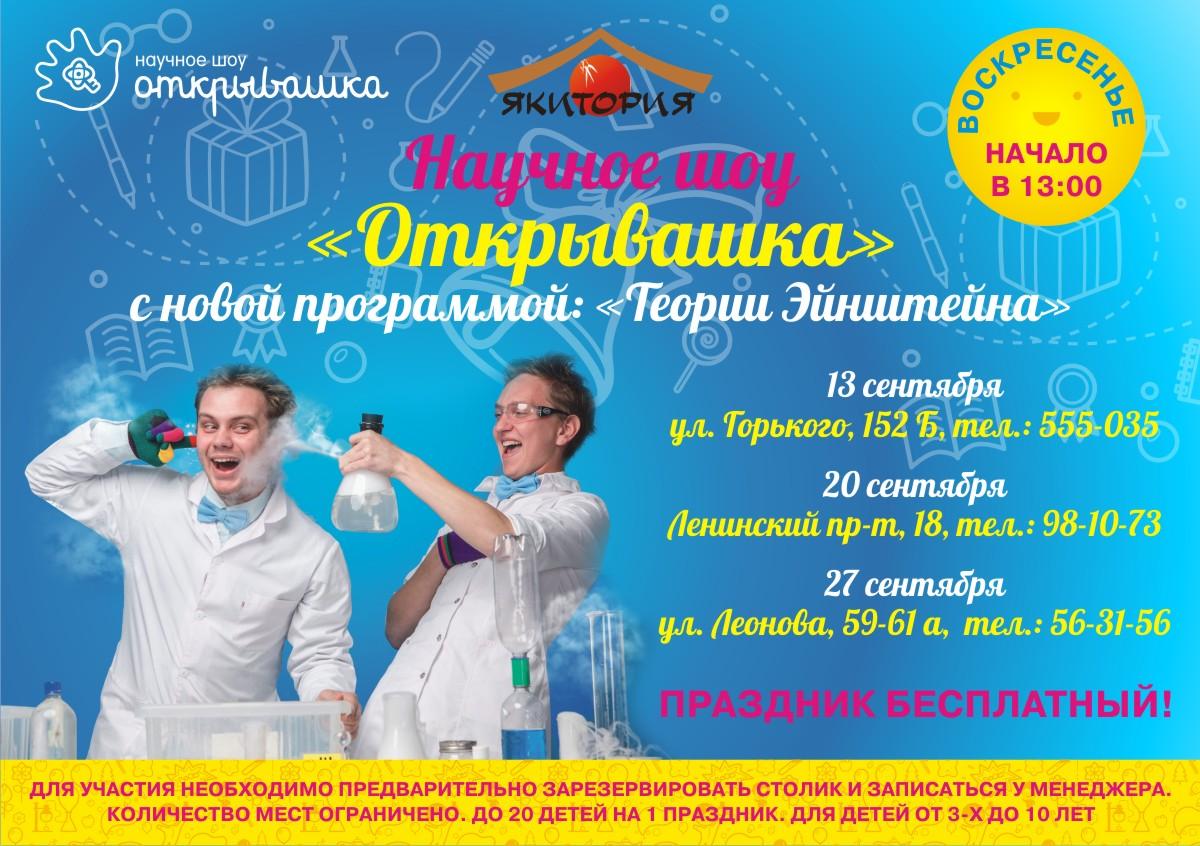 Сеть кафе «Якитория» приглашает на новую программу от детского научного шоу «Открывашка»: «Теории Эйнштейна».