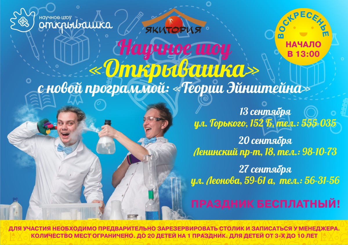 Сеть кафе «Якитория» приглашает на новую программу от детского научного шоу «Открывашка»: «Теории Эйнштейна».