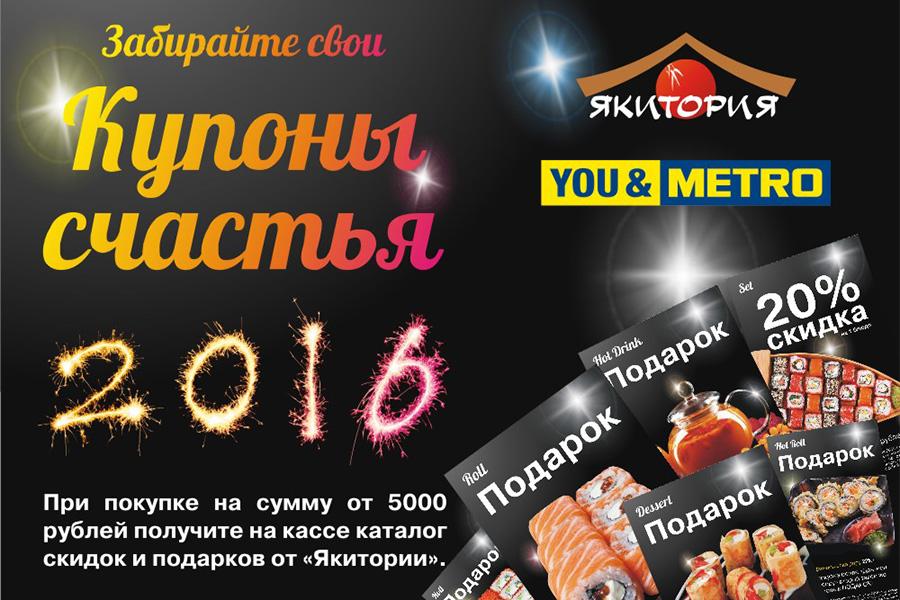 Набор «Купонов счастья» дает возможность получить различные подарки и скидки в наших кафе. Выдаются они на кассе в «METRO Cash & Carry» при покупке в ТЦ на сумму 5000 руб. до 30 декабря 2015 г.
