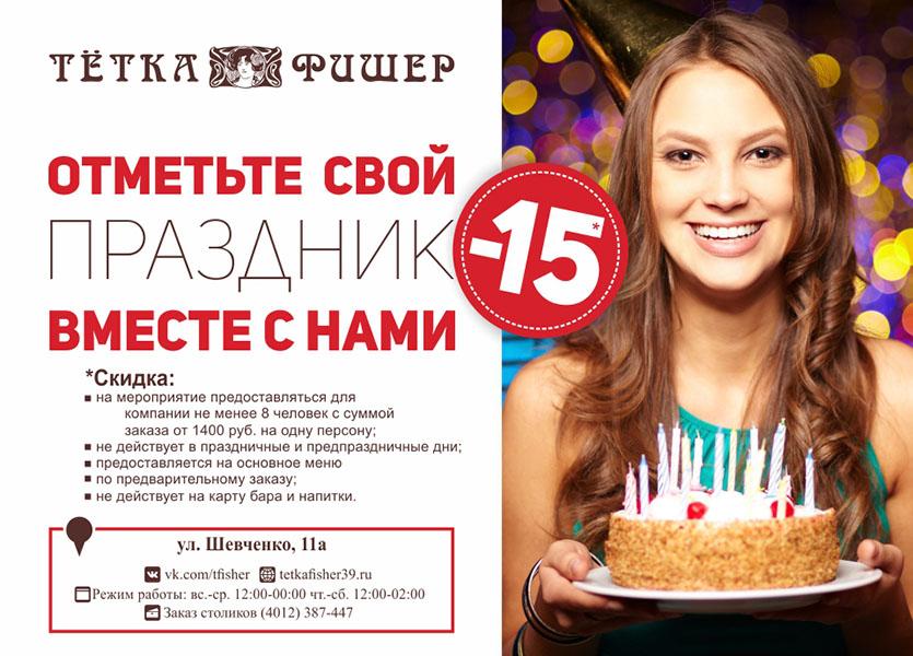 Отметь свой праздник в «Тетке Фишер» со скидкой 15% на основное меню!