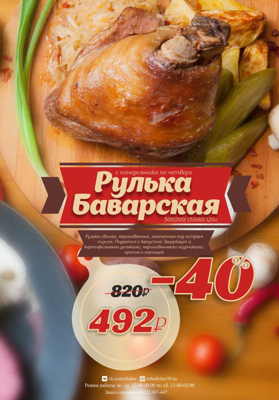 Попробуйте настоящую баварскую рульку в ресторане «Тетка Фишер» со скидкой 40% с понедельника по четверг.
