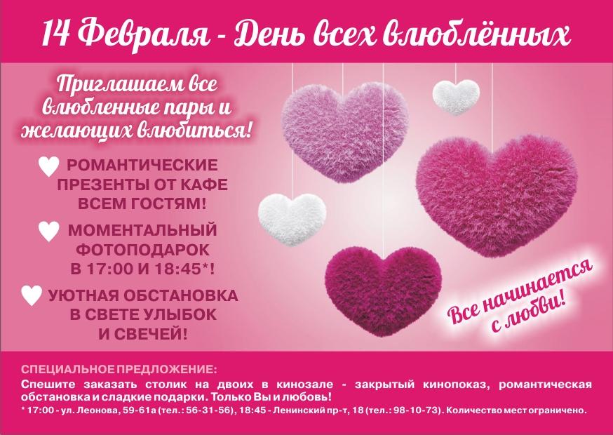 Специальное предложение в кафе «Якитория» ул. Леонова, 59 и Ленинский пр-т, 18: спешите заказать столик на двоих в кинозале — закрытый кинопоказ, романтическая обстановка и сладкие подарки. Только вы и любовь!