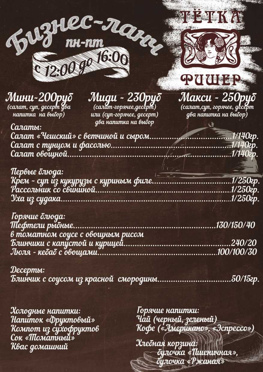 Ресторан немецкой кухни «Тетка Фишер» приглашает на душевный бизнес-ланч. С понедельника по пятницу с 12 до 16 часов. Мини-ланч — 200 руб. Медиум-ланч — 230 руб. Макси-ланч — 250 руб.