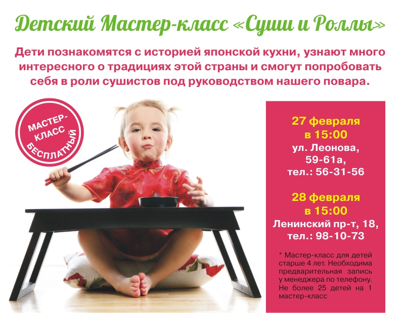 Ваш ребенок познакомится с богатой историей японской кухни, узнает много интересного о традициях и обычаях этой страны и сможет попробовать себя в роли сусиста под руководством нашего повара, приготовив вкуснейший ролл.