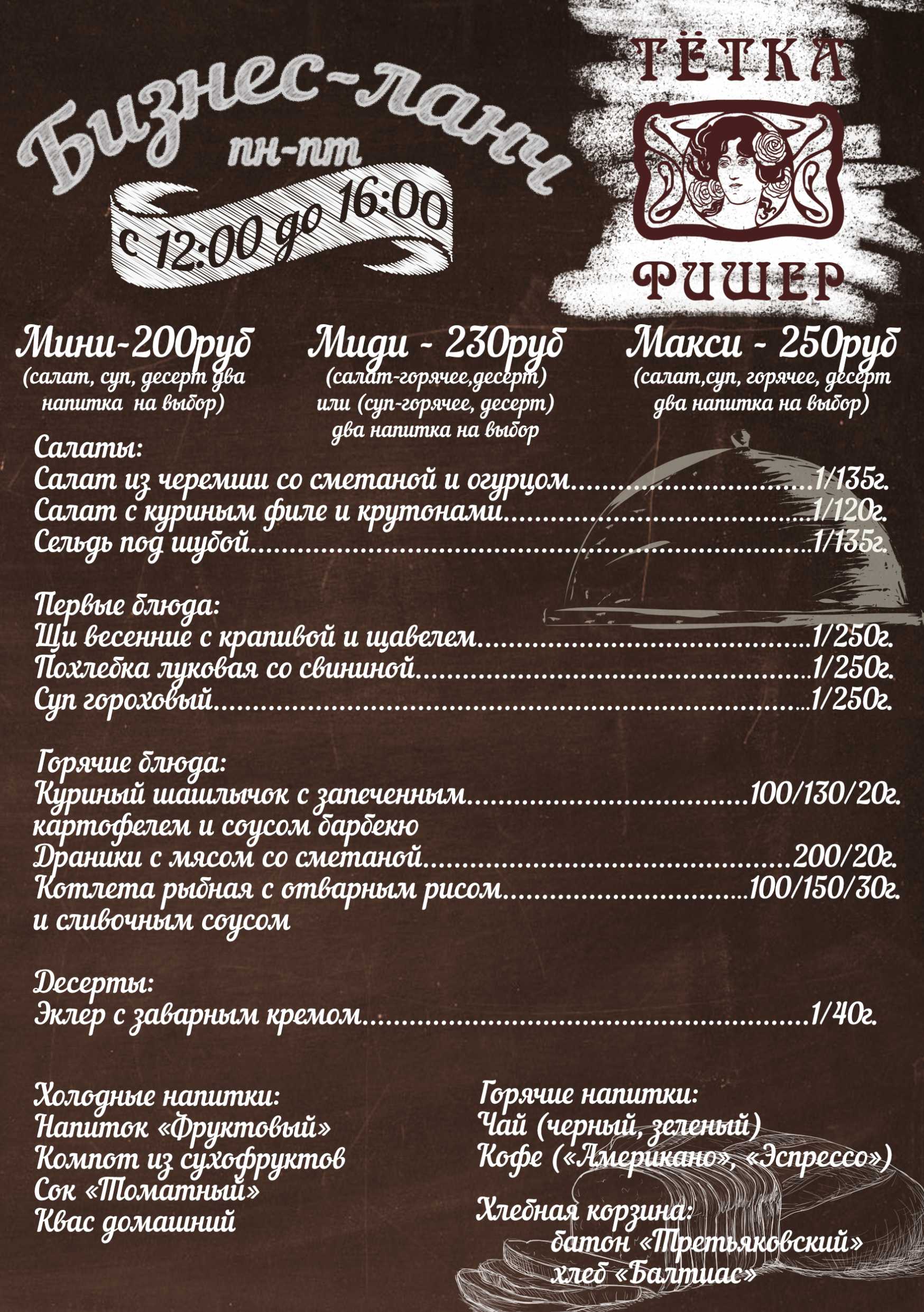 Ресторан немецкой кухни «Тетка Фишер» приглашает на душевный бизнес-ланч. С понедельника по пятницу с 12 до 16 часов. Мини-ланч — 200 руб. Медиум-ланч — 230 руб. Макси-ланч — 250 руб.