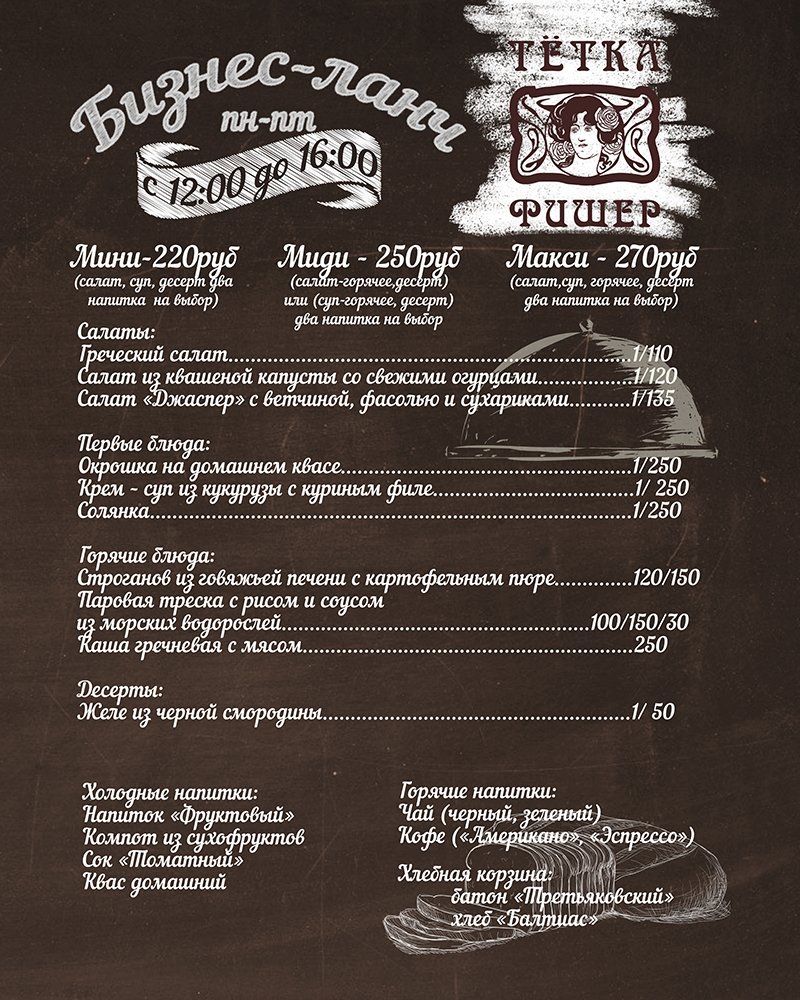 Ресторан немецкой кухни «Тетка Фишер» приглашает на душевный бизнес-ланч. С понедельника по пятницу с 12 до 17 часов. Мини-ланч — 220 руб. Медиум-ланч — 250 руб. Макси-ланч — 270 руб.