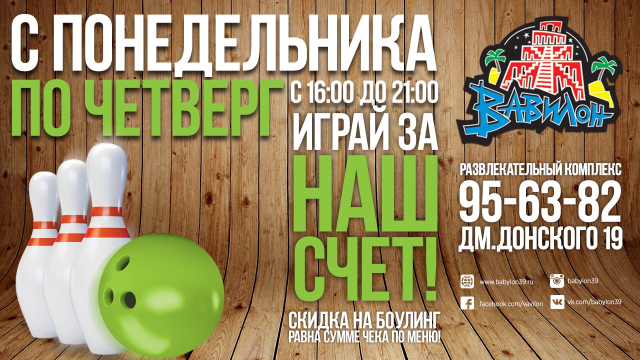 С понедельника по четверг с 16:00 до 21:00 действует акция «Играй за наш счет!». В это время скидка на боулинг равна сумме чека по меню! Отдыхайте с друзьями, наслаждайтесь приятными бонусами!