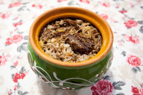 Всего около десяти наименований, с мясом и без: есть пшенная или перловая со свининой (каждая по сто рублей), а есть пшеничная с курагой и с тыквой (70 рублей за горшок) и кукурузная с черносливом за такую же цену. Мы заказали по одному «мясному» горшку: с перловкой и гречкой. И в том и другом случае каши рассыпчатые — перловка так вообще той правильной консистенции, когда лопается во рту. Масло и соль обнаруживаются ближе к середине порции.