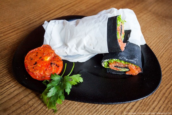 С семи до одиннадцати утра здесь ждут на завтраки: омлет с ветчиной, глазунья, яйцо-пашот (всё по 140 рублей), овсяные и рисовые каши, сырники. Для тех, кто любит что-то более основательное — бифштекс с яйцом (170 рублей). Основное меню можно назвать «бутербродным» — это пара бургеров (есть, например, с куриной котлетой, а есть с ростбифом — каждый по 290 рублей), панини, гамбургеры и тортилья. Из бутербродов мы заказали чёрную тортилью с мягким сливочным сыром и лососем (290 рублей). Готовили ее около двадцати минут. Официант принес два едва тёплых рулета из тонкого теста, начиненных рыбой и сыром. Плюс на гарнир холодный запечённый в травах помидор. Вернее, половинка помидора. Персонал до невозможности вежлив и пытлив: «Вам все понравилось? Может быть, что-то не совсем так?». Замечания по поводу той закуски, которая должна была быть относительно горячей, сказали, что исправятся. Будем ждать. С напитками пока что у «Port-o-coffee» получается лучше, чем с едой.