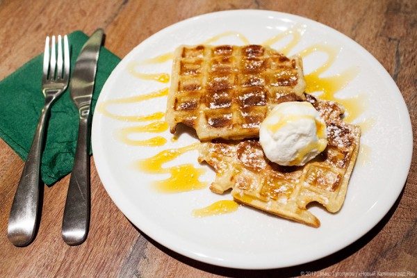 Следующий раз (то есть вот этот) оказался более удачным: Лапшин в, кажется, целых штанах то стоял за барной стойкой, то царил на кухне, но пасты не было вообще — её съела толпа гостей накануне. Тогда мы заказали монреальский сэндвич (два вида мяса, зелень, огурец, хрустящая булочка за 170 рублей), порцию хрустящих вафель с кленовым сиропом и шариком мороженого (180 рублей за вафли плюс отдельно тридцать за мороженое), два эспрессо (по 120 рублей) и чашку горячего шоколада (100 рублей). Ну что ж, пробуя сэндвич в «Новостях», с нежностью вспоминаешь панини из
