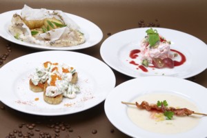- Торретто из лосося 1/90 (лосось слабосоленый, авокадо, коктейльная креветка, лук- порей, сливки, карри);