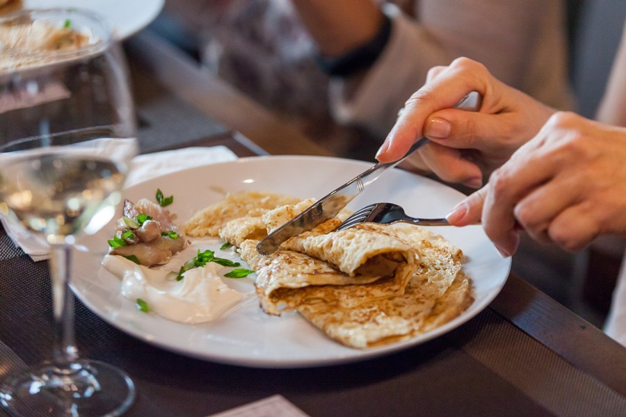 После винегрета черёд красных блинов. Тут необходимо учесть, что цвет у них вполне традиционный, золотистый, и «красный» в названии — всего лишь синоним красоты. Это и правда очень красиво — как очень плотное и в то же время рыхлое кружево. Готовятся такие блины на гречишной опаре, за счёт чего их вкус с лёгкой и приятной кислинкой. В качестве начинки полагается немного сметаны, зелёного лука и нежнейшей провесной скумбрии. То есть да, старинное русское блюдо, с некоторым региональным акцентом. После винегрета и блинов как раз и следует гастрономическое открытие — тарелка рахмановских щей. Опять же — в основе старинная рецептура, крепкий бульон из нескольких видов рыб, немного овощей, но в качестве главного компонента не свежая или квашеная капуста, а морская, вместо привычной ложки сметаны — яйцо пашот. После щей пятиминутный перерыв — и уже несут дымящуюся чугунную сковородку с московской солянкой — томлёная квашеная капуста с уткой, тонкими дольками сладкой груши и смородины. И как заключительный аккорд — ломтик красной сливы, настолько кислой, что скулы сводит. И в заключении — десерт, ягодная сезонная пятиминутка под шапкой овсяного киселя с цветками васильков — вот они, те самые обещанные сказочные молочные реки с берегами. Вместо аплодисментов — звон приборов и посуды, вместо занавеса — опустевшие столешницы.