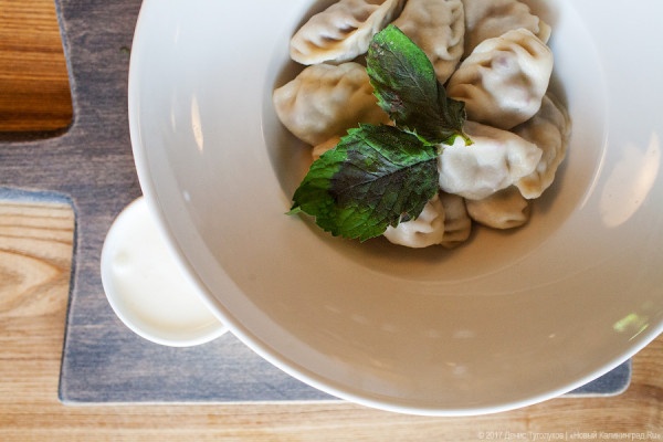 Заказали две порции пельменей (с сыром и шпинатом и те, которые с вишней) плюс фламкухен с лососем. С пельменями всё очень здорово — начиная от подачи и заканчивая вкусовыми качествами. Тебе приносят деревянную доску с маленькими кастрюльками и мисочками — здесь пельмени, здесь бульон, здесь шпинатный соус, всё очень горячо, вкусно и ароматно. Одно но — в нашем случае приносят через сорок минут. В качестве уточнения: это был не выходной день, зал был заполнен меньше чем на половину, официанты роняли посуду, путались в заказах, забывали принести приборы и так далее. Фламкухен с лососем приносят тоже на деревянной доске, выстланной пергаментной бумагой, дымящимся и ароматным, но тоже спустя минут тридцать. И если к пельменям претензий нет, то к пирогу их несколько: нам подали лепёшку из дрожжевого теста, очень плотную, очень тягучую (самое правильное решение после мытарств с ножом и вилкой было просто рвать её руками), пресную, местами откровенно подгоревшую. Учитывая, что в гастрономической памяти существует совсем другой фламкухен — из тончайшего, как бумага, и очень вкусного теста — видеть и есть вот это блюдо было очень странно. Не менее странным кажется и отношение персонала. Просим счёт, подходит девушка и спрашивает: «Вы заказывали кофе и лимонад?». Говорим, что нет. Через пару минут подходит другая девушка и спрашивает: «У вас вино и сырная тарелка?». Снова не угадали. С третьей попытки получили всё же счёт, немного сокращённый за счёт времени, потраченного на ожидание блюд. Также (и это к чести персонала) получили в качестве комплимента тарелку с кусочками десертов: здесь неплох «Медовик» — в меру сладкий и какой-то домашний. Но вот что касается коммуникации с гостем — это отдельная история. Официантка спрашивает: «Всё ли понравилось?» — ну вроде как дежурный вопрос, но всё же надо сказать правду. И ты ей честно говоришь, что с пельменями порядок, медовик неплох, но вот фламкухен — это полный провал, он жёсткий, подгоревший, и вообще это не он, на что получаешь равнодушное пожимание плечами и фразу: «Ну, бывает, что он не всегда получается». Бывает.