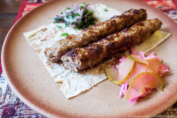 Первым приносят тжвжик — это обжаренные в сливочном масле с помидорами и специями потроха — приносят в тяжёлой чугунной сковородке. Это невероятно вкусно и горячо, всё, что осталось в сковородке спустя десять минут, нужно обязательно вымакать вот этим самодельным хлебом. Чуть позже — люля-кебаб из баранины, на тонком, как лист бумаги, лаваше. И тут тоже без неожиданностей — вкусно, в меру сочно, в меру остро. Фокус в том, что от армянской кухни ждешь не какой-то яркости вкуса, которую обычно дает грузинское застолье (тут нужно понимать, что армянская кухня гораздо консервативнее и сдержаннее), не душевности (да какая душевность в этом пафосе с бархатными раковинами), а щедрости. Судите сами, вот тжвжик присыпан щепоткой рубленной зелени — её совсем ничего, чайная ложка. Нет, понятно, что кинзу и базилик едят не все, но официант может же спросить, вам зелени побольше или поменьше.
