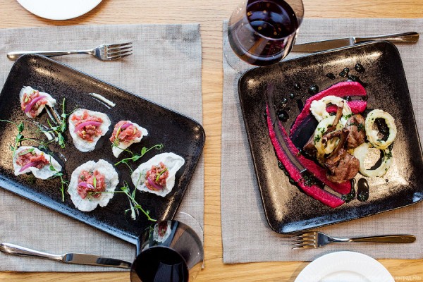 Цитаты из меню: тар-тар из говядины на рисовых чипсах с соусом айоли (395 рублей), суп Минестроне (195 рублей), пенне с кроликом, таджасскими маслинами и ароматным трюфелем (395 рублей), пицца Маргарита (245 рублей), салат с ростбифом из вырезки, чечевицей и зелёным яблоком (360 рублей), каре ягнёнка с красным луком в темпуре, с хумусом со свеклой, фудуком и свежими травами (695 рублей). Десерт Тирамису (250 рублей), пирожное Цитрон Верде (290 рублей).