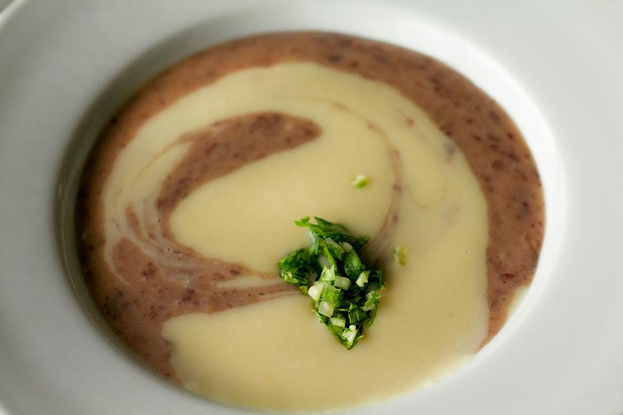 Ингредиенты: куриный бульон — 150 гр., картофель — 100 гр., лук репчатый — 20 гр., корень сельдерея — 20 гр., чеснок — 5 гр., красная консервированная фасоль — 80 гр., белая консервированная фасоль — 80 гр.
