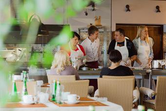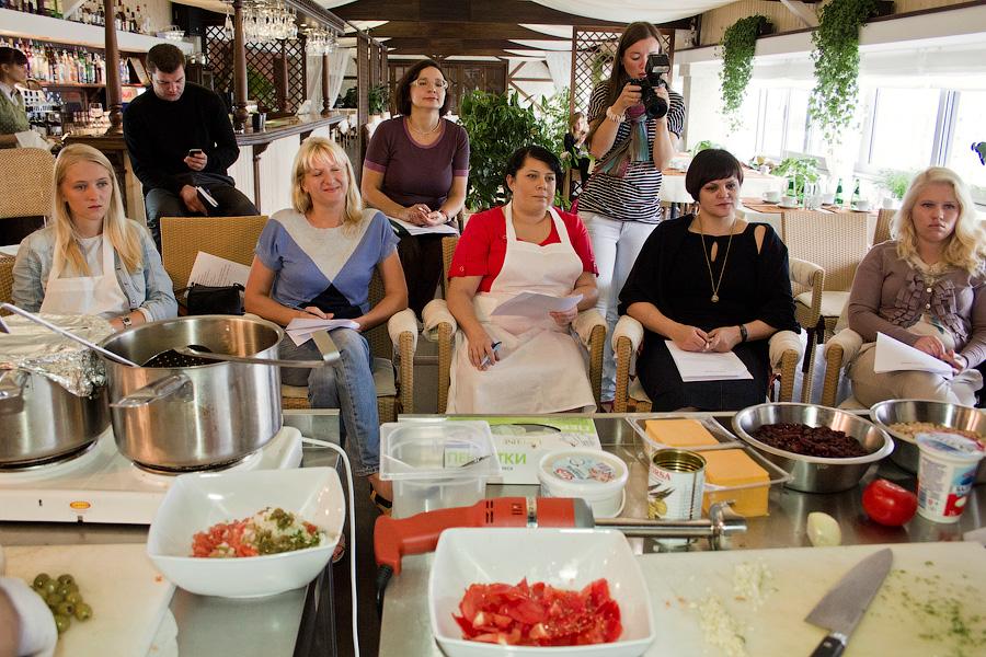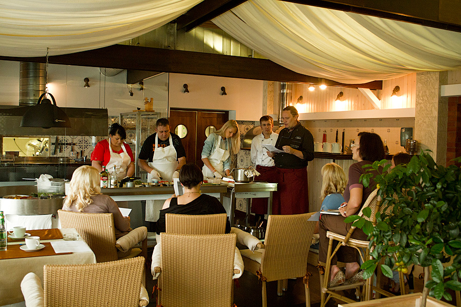 С тех пор, когда я в смешной пижаме по выходным смотрела передачу «Смак», изменилось лишь то, что теперь на кулинарные курсы я хожу добровольно, и вместо Макаревича меня и других любителей, желающих научиться готовить «не хуже, чем в ресторане», встречает не кудрявый дед Макар, а здоровенный Кеннет Линдберг. Другие желающие — это восемь человек, в основном женщины, записывающие каждое слово шеф-повара. Механизм работы курсов такой: все собираются в «Террасе» по субботам в 9:30 утра, рассаживаются вокруг открытой кухни с блокнотами и ручками, могут в любой момент подойти поближе и посмотреть, что получается, переспросить, и, кроме того, стать помощником Кеннета — порезать овощи, перемешать салат и так далее.