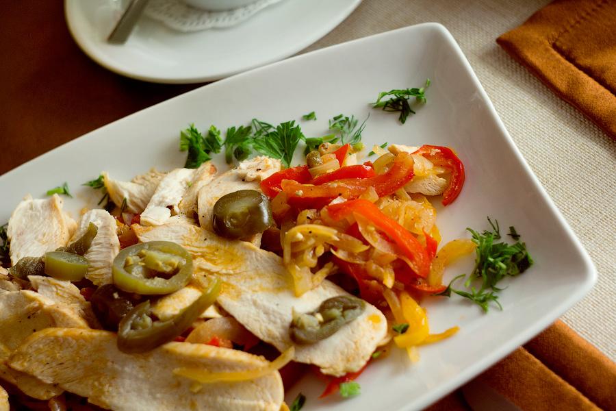 Для фахитос Кеннет советует брать филе не куриной грудки, а бедра — такое мясо сочнее. И в том, и другом случае с куриного филе нужно снять пленки, нарезать вдоль волокон, обжарить на сковородке пять минут и после этого еще поставить в духовку минут на 10, тогда оно будет не сухим. Готовое жареное мясо режется по диагонали и соединяется с овощами. Вы кладете эту смесь на теплую лепешку, поливаете сверху соусом — томатной сальсой или гуакамоле, сворачиваете лепешку трубочкой или складываете конвертом — и приятного аппетита!