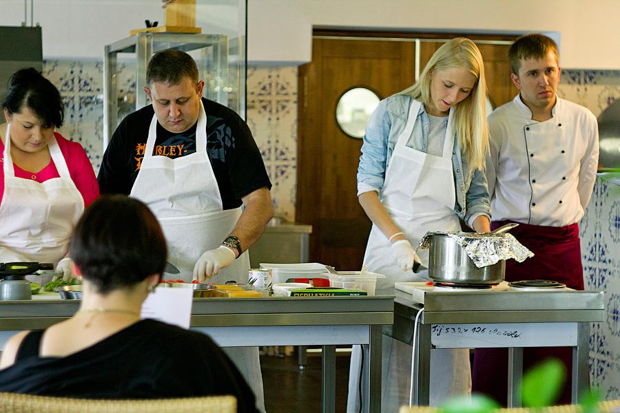Каждому участнику курсов выдается тарелка, к кастрюлям с супом выстраивается очередь: «Вы должны попробовать налить и смешать его сами. Пусть это получится не так красиво, как у меня, но ничего страшного, зато в следующий раз, у себя на кухне вы будете это делать уже просто мастерски».