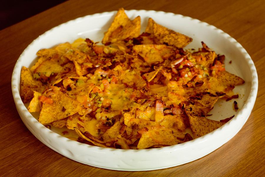 Чипсы нужно уложить в посуду, предназначенную для запекания в духовке, желательно с толстыми и высокими стенками. Поверх кладется томатная сальса, сыр чеддер, порезанный длинными прямоугольными ломтиками и веточки кинзы. Блюдо ставится в духовку, разогретую до температуры в 180 градусов, на 5–7 минут, то есть до того момента, пока сыр не расплавится.