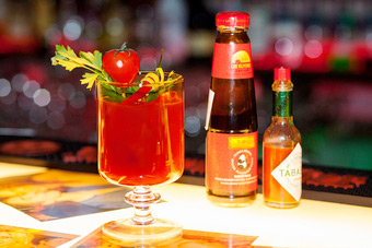 Ингредиенты: 200 мл томатного сока, 50 мл мексиканского напитка «Мескаль», 20 мл апероля, 1 чайная ложка устричного соуса, 4 капли острого соуса «Табаско», соль и черный молотый перец по вкусу, веточка петрушки.