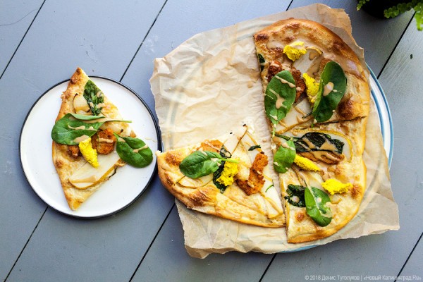 В принципе, попробовать хочется всё, но мы остановились на двух позициях из меню — пицце с грушей, сыром из кешью, копчёным сейтаном и шпинатом (260 рублей) и авокадо фри с томатным соусом (190 рублей). К оплате принимают и наличные, и карты. Заказ приносят быстро. Подача блюд — замечательная, к тому же — никакой одноразовой посуды. Но после того, как начинаешь есть, вздыхаешь и говоришь — ну вот, опять. Тут претензия примерно такого же толка, которую мы предъявляли в самом начале года к кафе «Плохой охотник» — эта еда кажется основательно пресной. Да, прелесть поджаристых ломтиков авокадо как раз в ловкой хитрости — похожих на обуглившуюся крошку оливок, которые привносят необходимую солёность и пряность. В крайнем случае можно прибегнуть к домашнему в меру острому, но густому и сочному томатному соусу, который подают к авокадо, но вкусно и так и так. Что касается пиццы, то с ней не всё так оптимистично, и если где-то соус необходим, то именно здесь: пресное, слегка резиновое тесто не спасает ни твёрдая (и, к сожалению, безвкусная груша), ни тофу, ни, прости господи, копчёный сейтан — это такое мясо из пшеницы. Очень хочется надеяться, что с остальными блюдами не всё так печально.