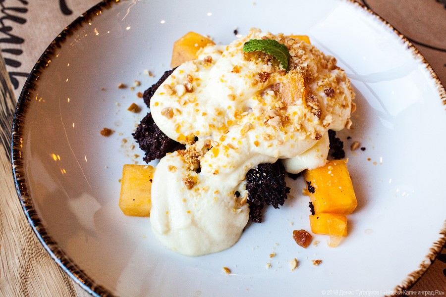Если от основных блюд переходить к десертам, то пока они не впечатляют. Попробовали сметанник с хурмой, шоколадным брауни и миндальной крошкой (195 рублей) — разочаровались. Сметанный крем жидкий, с отчетливым запахом и привкусом лимонной кислоты, кусочки брауни не соединяет, а просто расползается по тарелке. Говорят, что над десертами еще поработают — подождем и проверим еще раз. Что касается разных напитков, то здесь интересная авторская коктейльная карта: в каждой смеси присутствует базилик, и этому знакомству нужно посвятить отдельный вечер. Если говорить о чистых благородных напитках, то здесь вполне демократичные цены на красное и белое. Кофейная карта — стандартная.