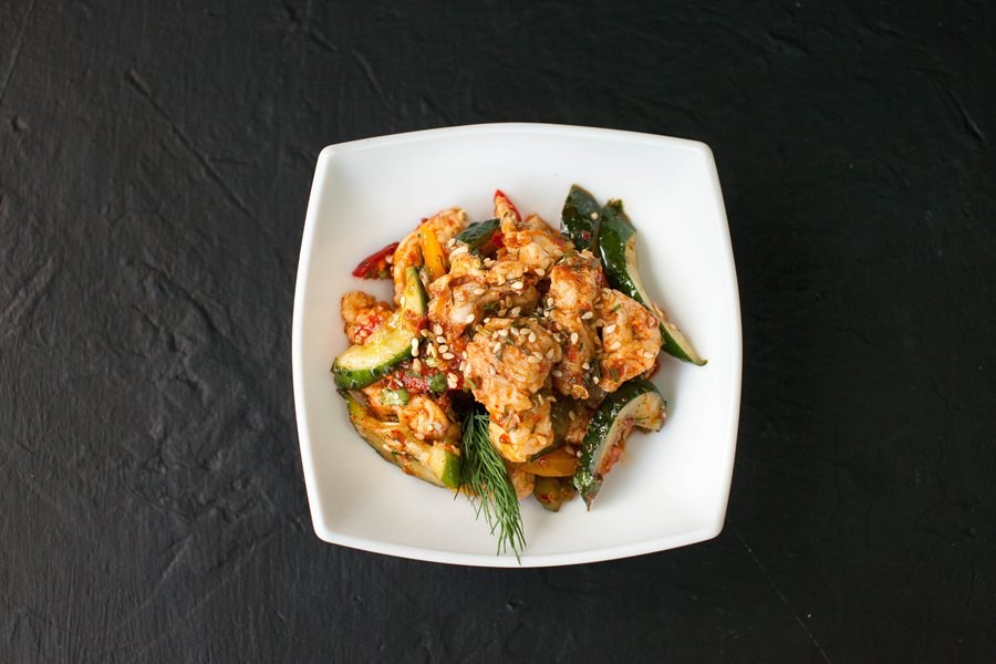 Если продолжать эту тематику, то обязательно попробуйте здесь рыбу-виноград в кисло-сладком соусе. В глубокой сковородке приносят филе судака, порезанное кубиками и зажаренное в воздушном нежнейшем кляре до золотой корочки. Похоже это и вправду на большую гроздь винограда без косточек. Филе разделано безупречно, и подойдет это блюдо тем, кто не любит тратить время обеда или ужина на слишком долгую возню со столовыми приборами. Еще одно нововведение «КуксиMOON» — это комплексные национальные обеды. Подают их с полудня до трех часов дня, сет меняется каждый будний день и состоит из трех блюд. Остроту опять же можно регулировать по желанию. Главное, помните: мы начинаем обед не с салата или супа, а с риса.