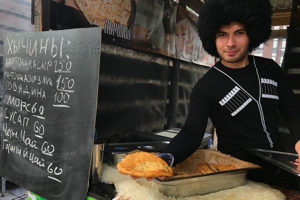 В субботу и воскресенье фуд-корт начинает свою работу с 10 утра. Лично я уже успела попробовать хычин с картофелем и зелёным луком от проекта «Один Хычин» — свежий, горячий и, главное, сытный то ли пирог, то ли чебурек, которого запросто хватит на двоих. Неплохо выглядит обычная сельдь под шубой в необычном исполнениям от новичков, кафе Del Dia. Блюдо называется «Сельдь в шубе Mundial», выглядит как настоящий европейский стрит-фуд (сельдь находится внутри картофельного шарика который обжаривается во фритюре), а пикантности ему придает крутой немецкий соус от шефа.