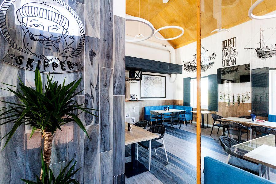 Интерьер «Шкипера» стремится к минимализму и скандинавскому стилю — простая деревянная мебель, высокий потолок, обшитый фанерным листом теплого оттенка, открывающиеся во двор окна во все стены. Придумали ресторан еще до начала пандемии и того периода, когда все кафе и рестораны закрылись на неопределенный срок. Владельцам «Шкипера» повезло со многими факторами: с арендодателями помещения, с командой поваров и официантов, которая все же решила остаться в общепите, не променять кухню на условную стройку, с гостями, которые сразу же после снятия ограничительных мер заняли свои места за столиками.