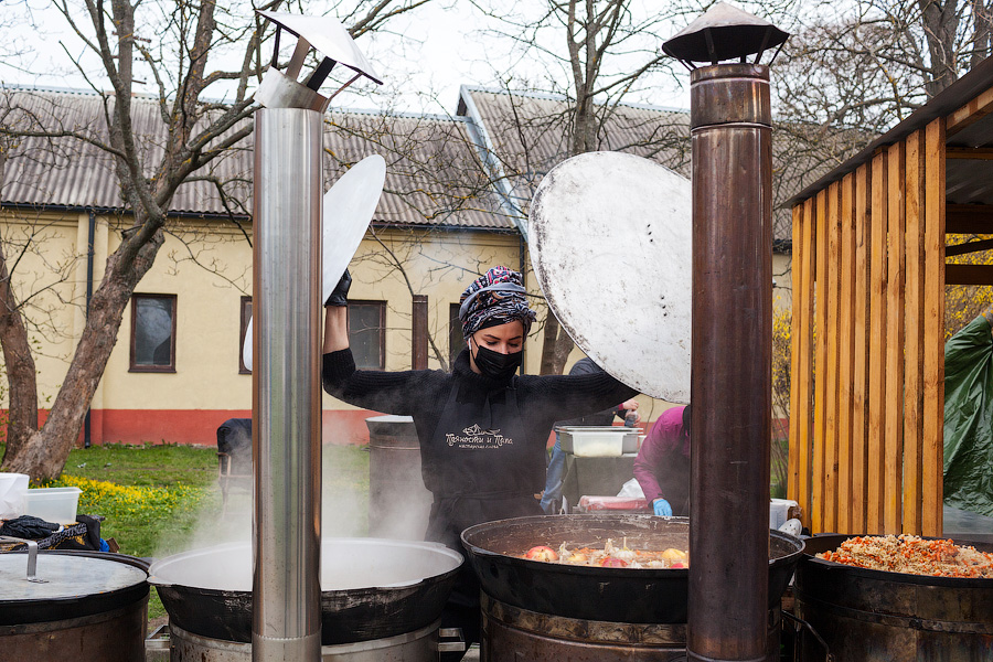 Есть и «нерыбное» меню: девушки из мастерской плова «Пряности и папа», по всей видимости, решили накормить все население Зеленоградска вместе с туристами и захватили огромное по фестивальным меркам пространство полудюжиной учаков с огромными казанами. Напротив — еще один блестящий и суперсовременный очаг: приз за победу в конкурсе Сталика Ханкишиева. Плов, впрочем, интересует прохожих куда больше, чем железное чудо.