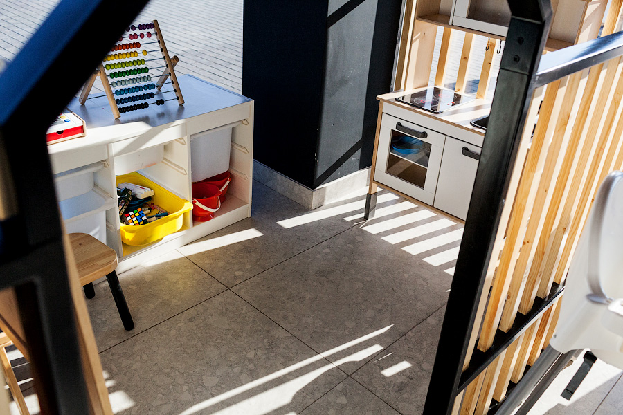Интерьер прост и аскетичен: глянцевая плитка открытой кухни с одной стороны, отделанная деревом стена с ярко-красными буквами — с другой. Еще две стены — полностью стеклянные, они и спасают не занятых своими смартфонами посетителей от скуки, позволяя наблюдать за окружающим миром в ожидании заказа. На столах — закрепленные рулоны бумажных полотенец вместо салфетниц. В углу — небольшой загончик для детей, наличие которого, очевидно обусловила калининградская традиция заводить при ресторанах детские комнаты. Убери оттуда ящики с карандашами и кубиком Рубика, поставь ясли вместо детской кухни — и можно вместо ребенка загонять вовнутрь не требовательного к условиям содержания небольшого бычка абердин-ангусской породы.