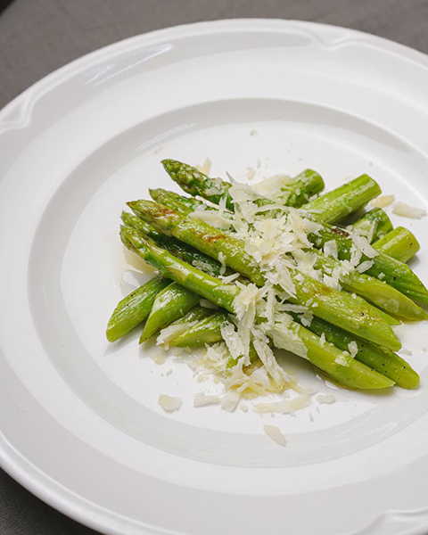 Подготовленную спаржу обжариваем до золотистого цвета на раскалённой сковороде. Используем растительное и сливочное масло, также добавляем нарезанный лепестками чеснок. Затем посыпаем блюдо хлопковой солью и чёрным молотым перцем. Готовую спаржу выкладываем на бумажную салфетку, чтобы удалить лишнее масло, затем — на тарелку. Овечий сыр нарезаем тонкой стружкой или натираем на самой тонкой тёрке и посыпаем поверх спаржи. Блюдо сбрызгиваем оливковым маслом с белым трюфелем и подаём к столу.