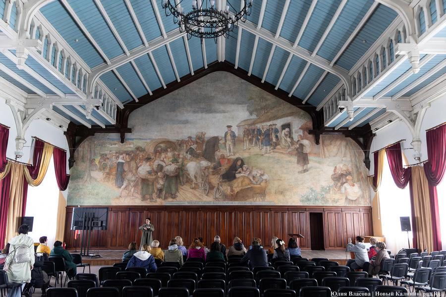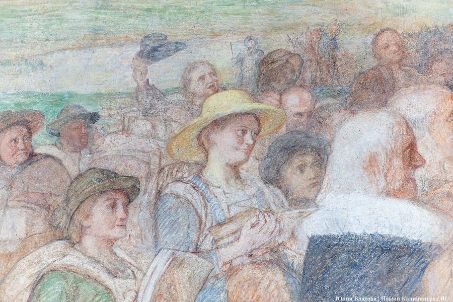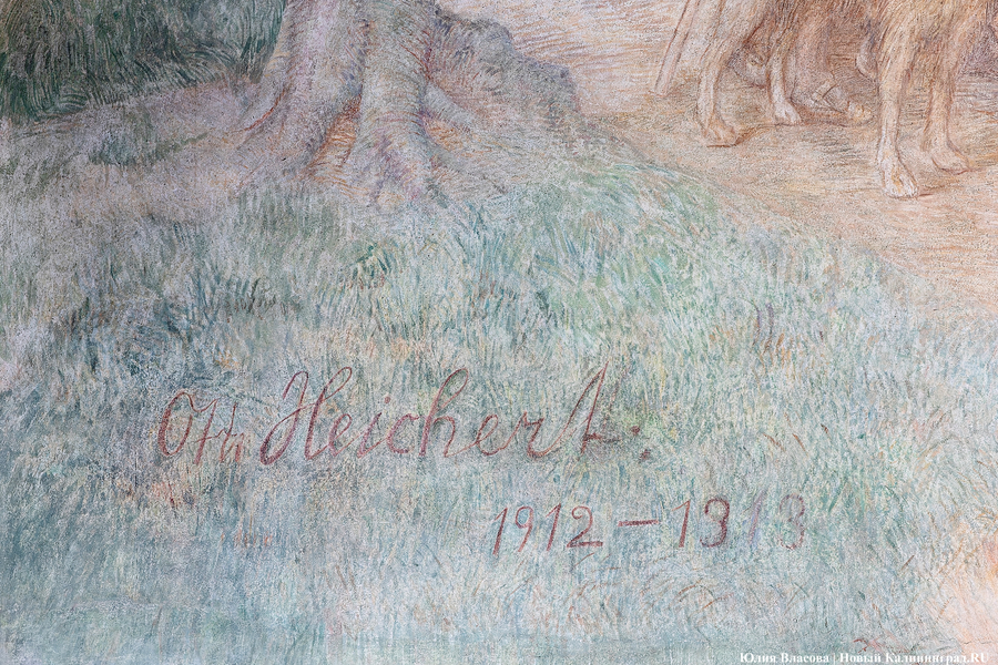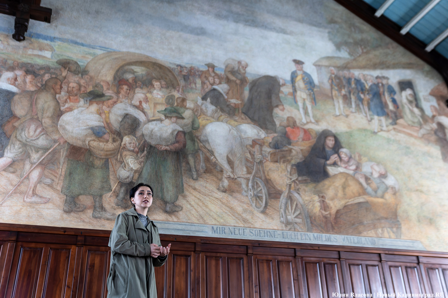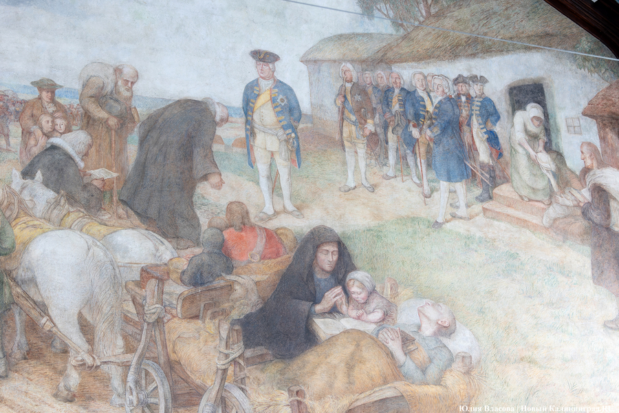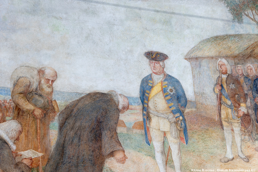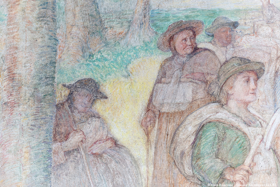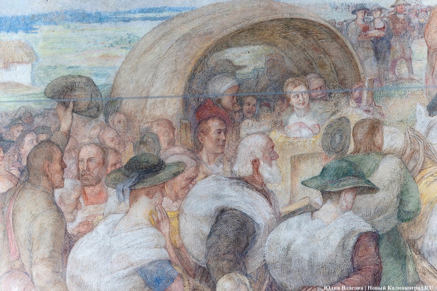 Фреска Отто Хайхерта в гусевском колледже агротехнологий и природообустройства в конце мая этого года отметила 16-летие своей реставрации. Работа площадью 32 квадратных метра, изображающая встречу зальцбургских переселенцев прусским королем Фридрихом-Вильгельмом I, была восстановлена в 2008 году (в советское время ее закрасили меловой краской). Эти работы проводились под руководством реставратора высшей категории Вячеслава Мозгового, прибывшего из Государственного Эрмитажа (под его руководством также восстанавливались горельефы на Королевских воротах). Фреска была создана профессором кенигсбергской Академии художеств Отто Хайхертом в 1913 году. О процессе ее создания и о людях, ставших прототипами короля и окруживших его переселенцев, «Новому Калининграду» рассказала экскурсовод и сотрудница Гусевского историко-краеведческого музея Галина Пелепенко.