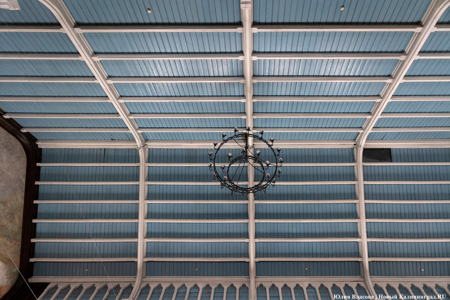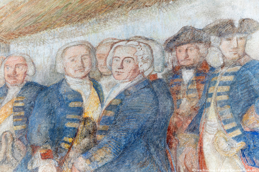 «Реставраторы сняли верхний слой изображения, и поэтому оно нам кажется более размытым и дымчатым. Также изначально потолок и небо на фреске были выкрашены в один тон, что придавало сюжету объем. Позднее окантовку сделала новая школа художников. Люстра в этом зале восстановлена, ее изготовили по старым эскизам и привезли немцы», — добавляет собеседник.